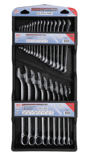 • 25 részes csillag-villáskulcs készlet, műanyag hordozható vagy felakasztható tartóban.