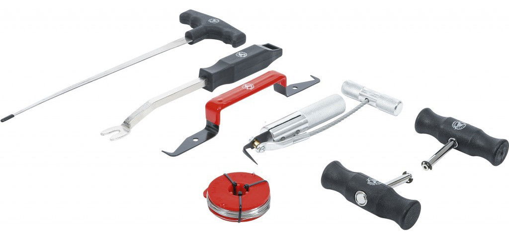 • 7 darabos speciális szélvédőkivágó készlet, minden olyan szerszámmal, mely a szélvédő kiszereléshez, üvegragasztó eltávolításához szükséges.